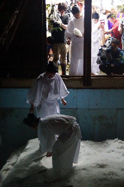 そこで昭和六十一年より湯涌温泉観光協会は、金沢市の協力を得て氷室の復元を努めてまいりました。以来、毎年一月の最終日曜に地元住民や金沢市民、観光客の皆様で雪を仕込んでいただき、踏み固められた氷は、六月末に氷室から切り出され、石川県知事、金沢市長、加賀藩下屋敷があった東京都板橋区、目黒区に贈呈されます。