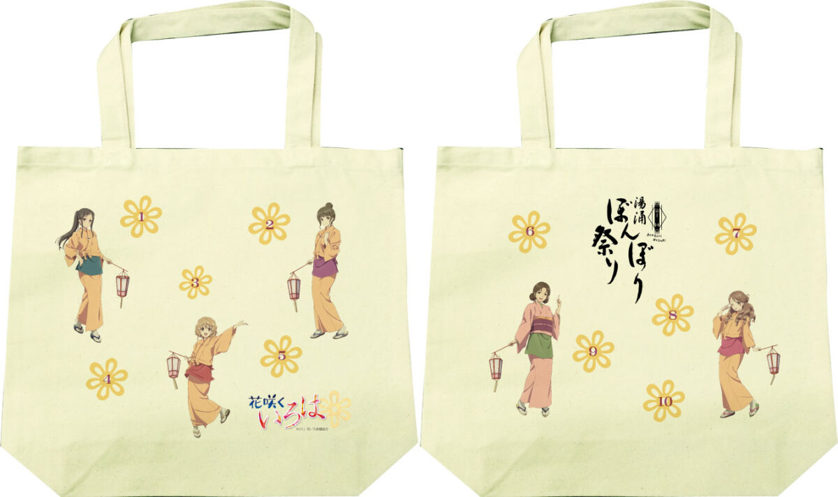「ぼんぼり」と「のぞみ札」を持った花咲くいろはのキャラクター達が両面に描かれたリバーシブルでお使いいただけるトートバッグ