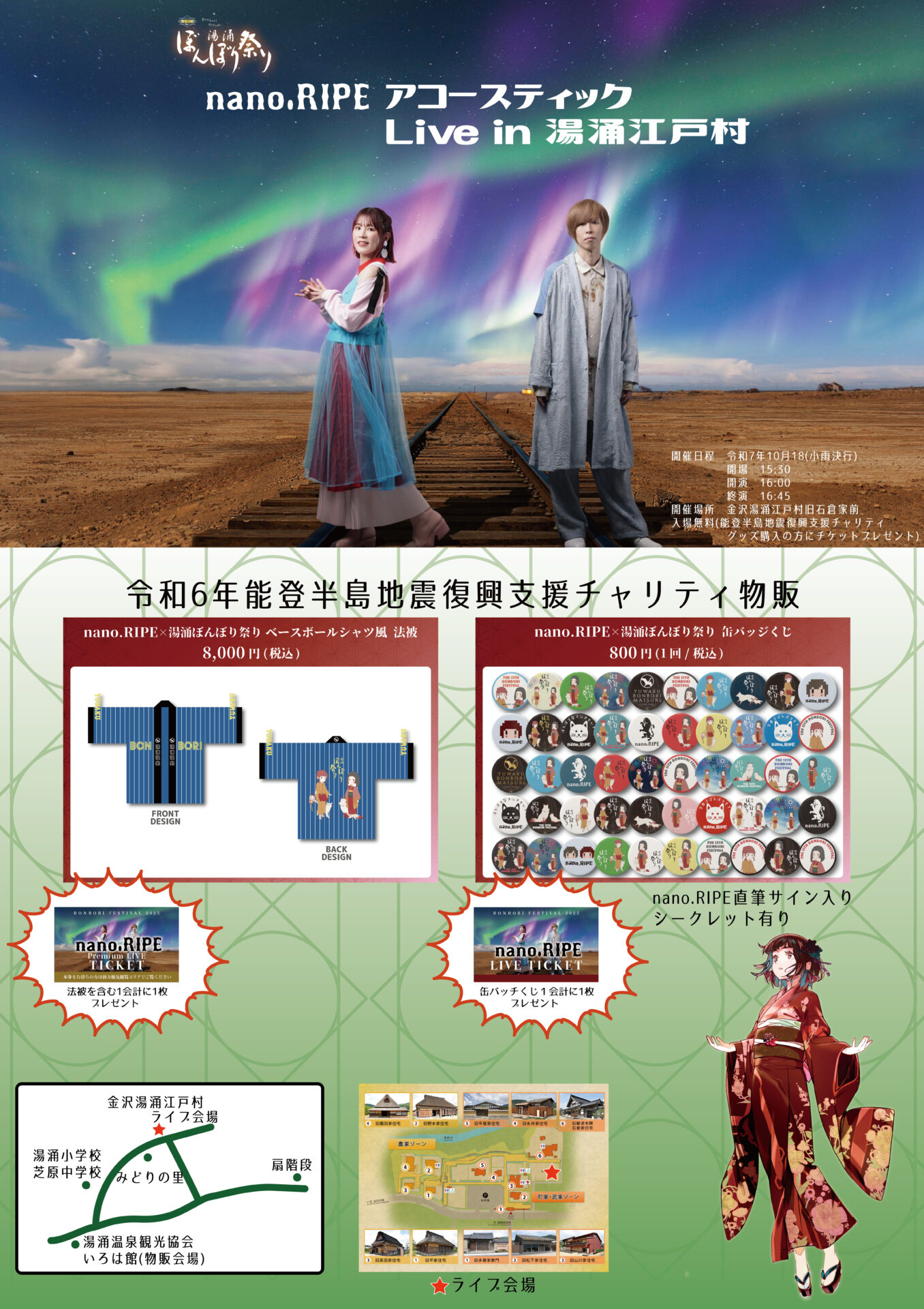 10月18日(土)16:00より「金沢湯涌江戸村内旧石倉家」会場にて開催予定でした「能登半島地震復興支援チャリティ nano.RIPE アコースティックライブLive in 金沢湯涌江戸村」は天候不良が予想されるため会場を「金沢市立湯涌小学校・芝原中学校体育館」に変更する事となりました。