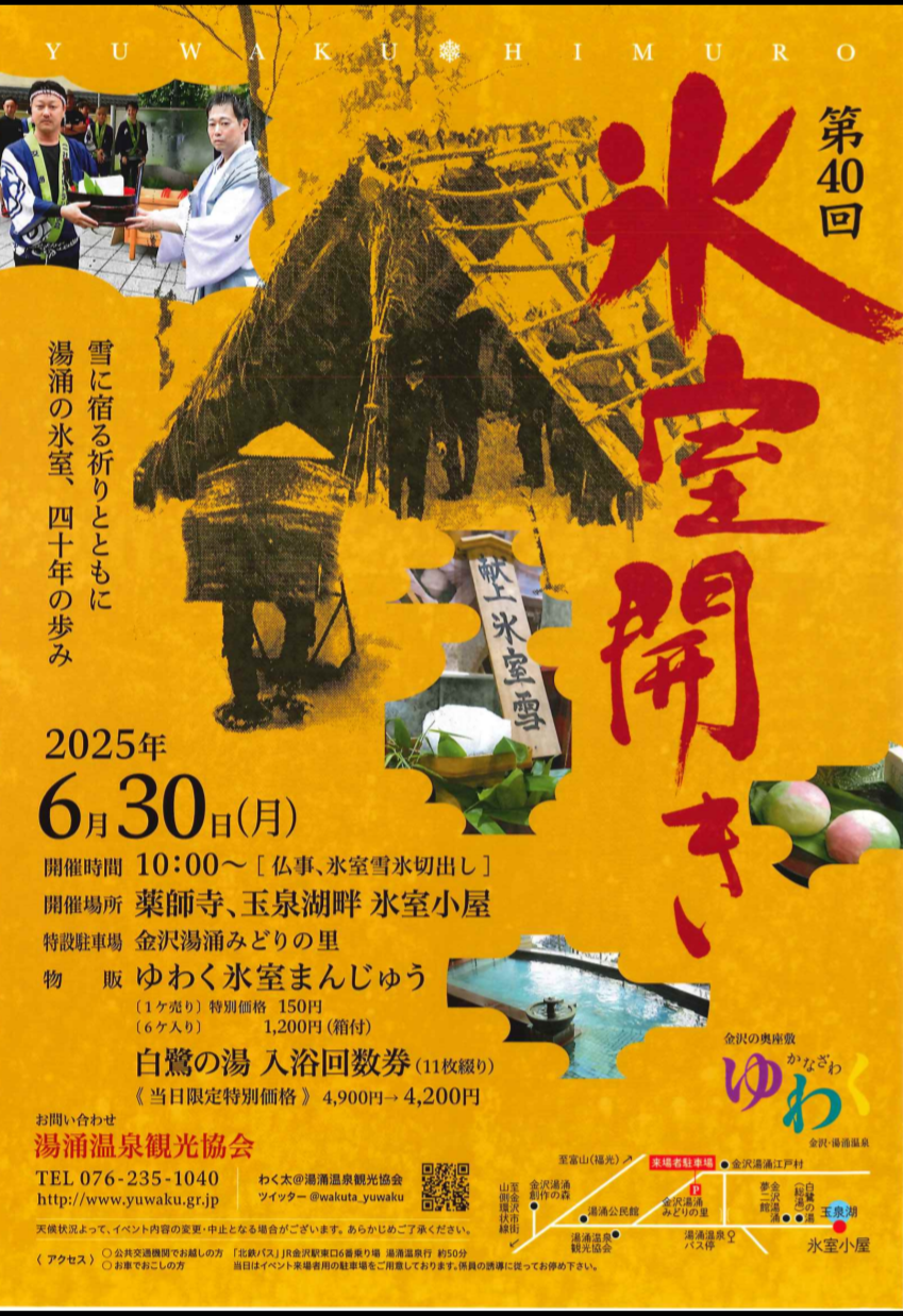 2025-06-22 「第40回湯涌氷室開き」開催のお知らせ 平素より湯涌温泉にご来訪、ご愛顧賜り誠に有難うございます。 夏の風物詩「氷室開き」は今年で40回目を迎えます。 金沢の伝統行事に触れてみませんか。 ※当日、行事終了後、一般の参加者さまに「雪氷」に触れる体験をいただけます。 開催日時:令和7年6月30日(月) 開催時間:10:00~ 開催場所:金沢湯涌 玉泉湖畔・氷室小屋/湯涌薬師寺 特設駐車場:金沢湯涌みどりの里 イベント名 「第40回湯涌氷室開き」開催のお知らせ 開催日時 開催場所 お問い合わせ この記事を共有する
