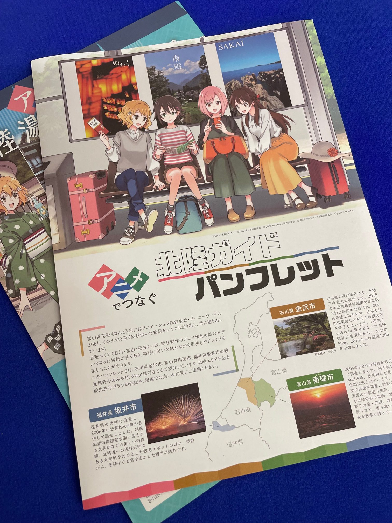 大勢の皆様にお楽しみいただいております「アニメでつなぐ北陸湯めぐりマップ」ですが、各地をよりお楽しみいただくための「アニメでつなぐ北陸ガイドパンフレット」が4月29日(金・祝)より下記の施設で配布されます。